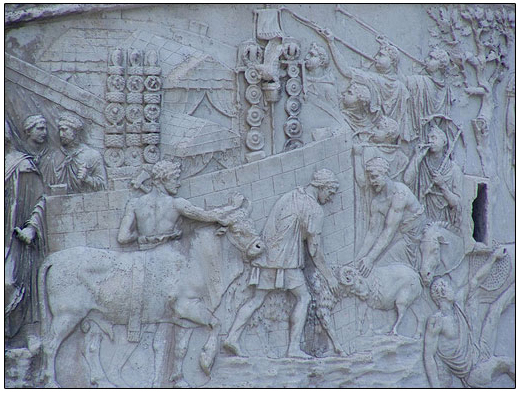 We can see in Mary Harrsch’s photographs of Trajan’s Column that it depicts, in great detail, episodes from Trajan’s two campaigns, beginning with making preparations for the invasions at the bottom levels, including preparations for the sacrificing of a bull to ensure a successful campaign, an important Roman ritual known as a suovetaurilia (Figure 4), and loading ships for the crossing of the Danube (Figure 5).