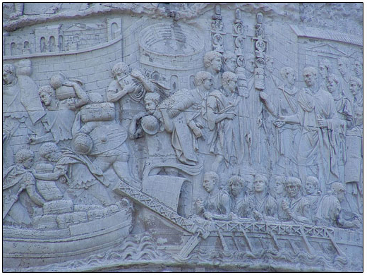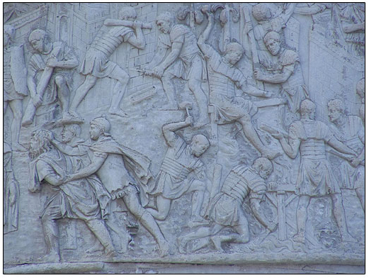 The vignettes on the sides of Trajan’s Column are arranged in a narrative form, as a spiralling or helical sequence in such detail and accuracy that they provide researchers with valuable insights into how the Roman army was outfitted and organised, and the tactics and war machinery they used. Activities portrayed include gathering food, medics attending the wounded, soldiers building, marching and fighting. Details of the lands the Romans passed through are also included. The marble figures are about 2/3 full size (Figure 12).