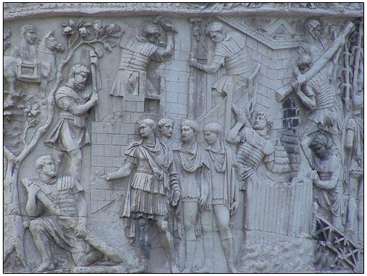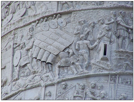Other scenes show soldiers building a bridge while a captive is lead away to the left (Figure 6), building forts (figure 7 and 8), and going into battle holding their shields in the interlocking testudo (tortoise) formation (Figure 9).