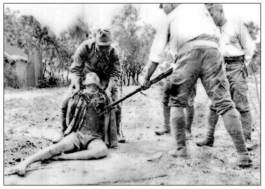 In July 1937, after a series of “incidents” between Chinese and Japanese forces, all-out war broke out on the mainland. The Japanese adopted the “Three Alls” policy: “Burn all, Seize all, Kill all”. For the first time, the world became aware of the merciless lengths that Japanese troops would go to in order to subdue their opponents. Trained in bushido, the code of the samurai, to observe complete obedience to the Shogun/Emperor and the principle of total and pitiless annihilation of the opposition by any means, the Japanese forces attacked Shanghai and Nanking, then the capital of China, slaughtering hundreds of thousands of Chinese soldiers and civilians (Figure 5). In these two cities, the undisciplined Japanese Army, “like an untamed horse left to run wild”, went on an orgy of rape, murder and pillage. Civilians were used for bayonet practice (Figure 6), and a gruesome competition between two Japanese soldiers to be the first to decapitate100 Chinese using a samurai sword was reported in Japanese newspapers (Figure 7). The behaviour of the Japanese soldiers, while not officially condoned, was given tacit approval by the officers in charge.
