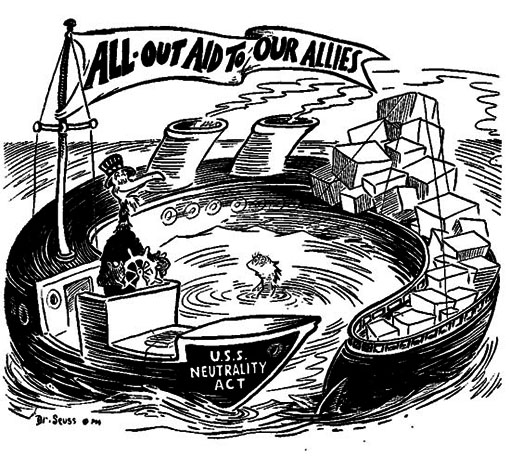 In the late 1930s, as war in Europe loomed, United States President Franklin Roosevelt publicly vowed to the American public that he would not involve their country in the fighting. At the same time, he was aware that if the war spread it would become inevitable that America would become involved, and he did what he could within the bounds of public opinion to support England in its struggle against Germany. “There is a vast difference”, he said, “between keeping out of war and pretending it is none of our business.”