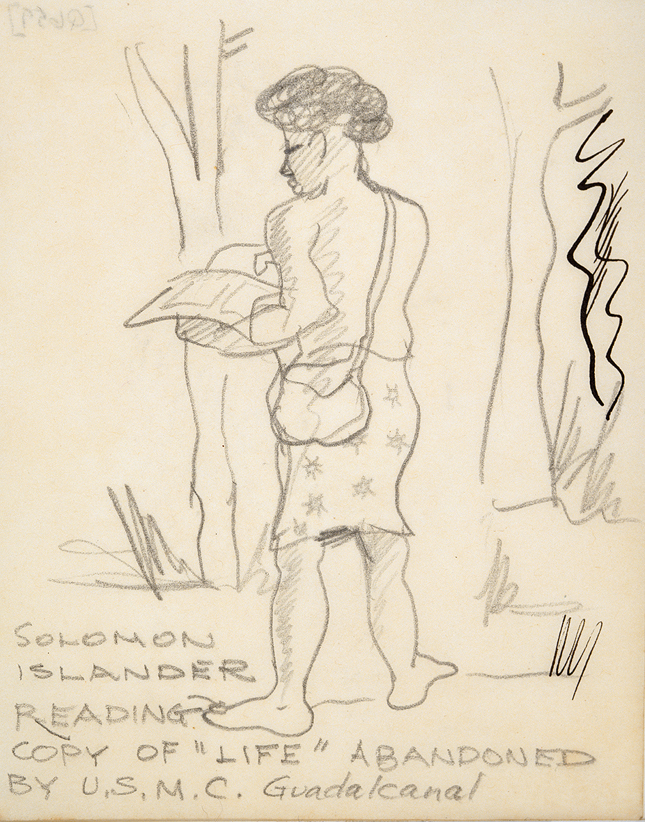 He was keenly interested in the lives of the local Melanesian people and made many studies of them engaged in daily activities (Figure 15). He was also moved by the range of physiognomical types he observed (Figure 16). He must have been struck by the incongruity he saw in the clash between the local culture and those of the invading foreign forces, epitomised in his drawing of a native man reading a discarded “Life” magazine (Figure 17).