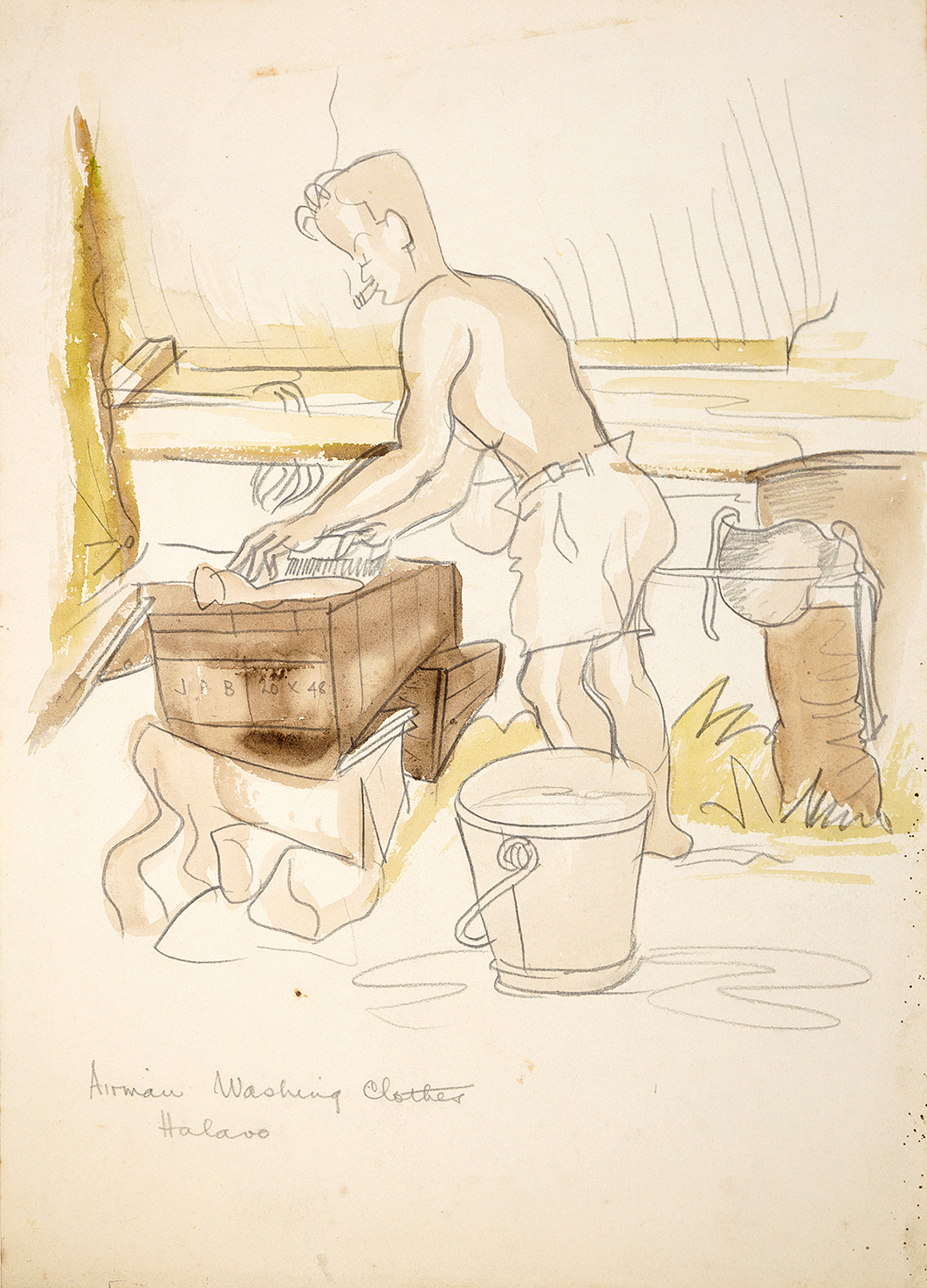 A love of art and drawing was clearly a major part of McPhee’s personality. While on active service in the Pacific it appears that he encouraged others to get out and record their surroundings and seems to have formed friendships with servicemen who enjoyed expressing their creativity in this way. Several of McPhee’s works depict fellow artists, sometimes working with drawing boards and easels in the open air in what appear to be joint field trips to various locations around Guadalcanal.