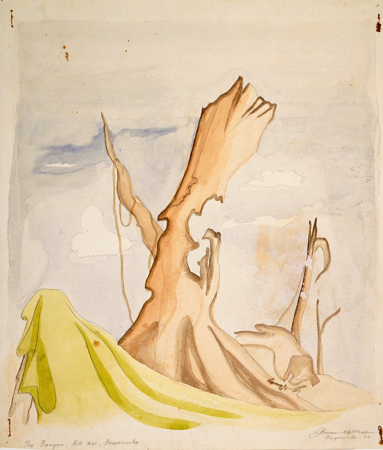 Like other soldier artists in the Pacific Theatre, McPhee appears to have been impressed by the surreal effects created by this clash of cultures, as first the Japanese and then the Allied military machines overwhelmed the simple lifestyles and pristine landscape of the Solomon Islands.