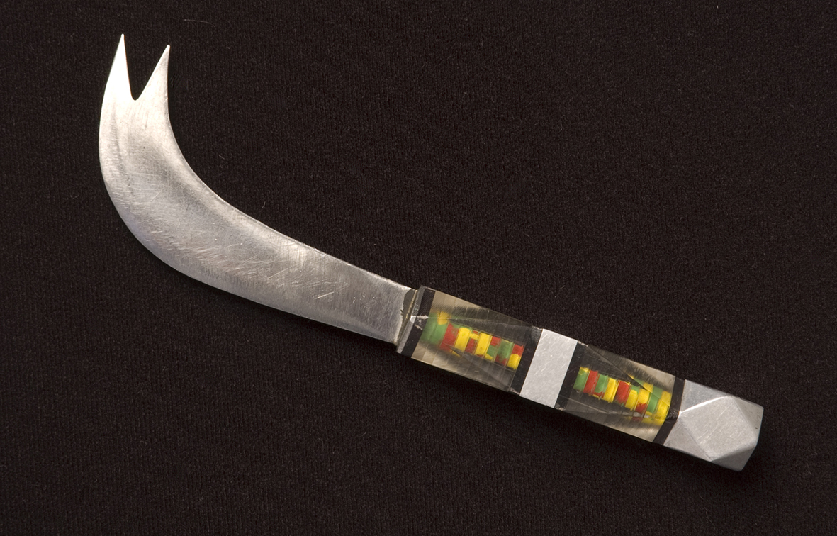 The variety of designs and the innovation involved in adapting materials at hand to manufacture this simple device is truly mind boggling. The most commonly used handle employed a .303 rifle bullet (Figures 1 and 2), but more sophisticated models used metal or perspex, sometimes in several layered colours (Figure 4 – 6), taken from aircraft. The latter were glued together and probably shaped on a lathe. The degree of sophistication achievable using this technique is demonstrated by the cheese-knife shown in Figure 6.