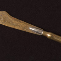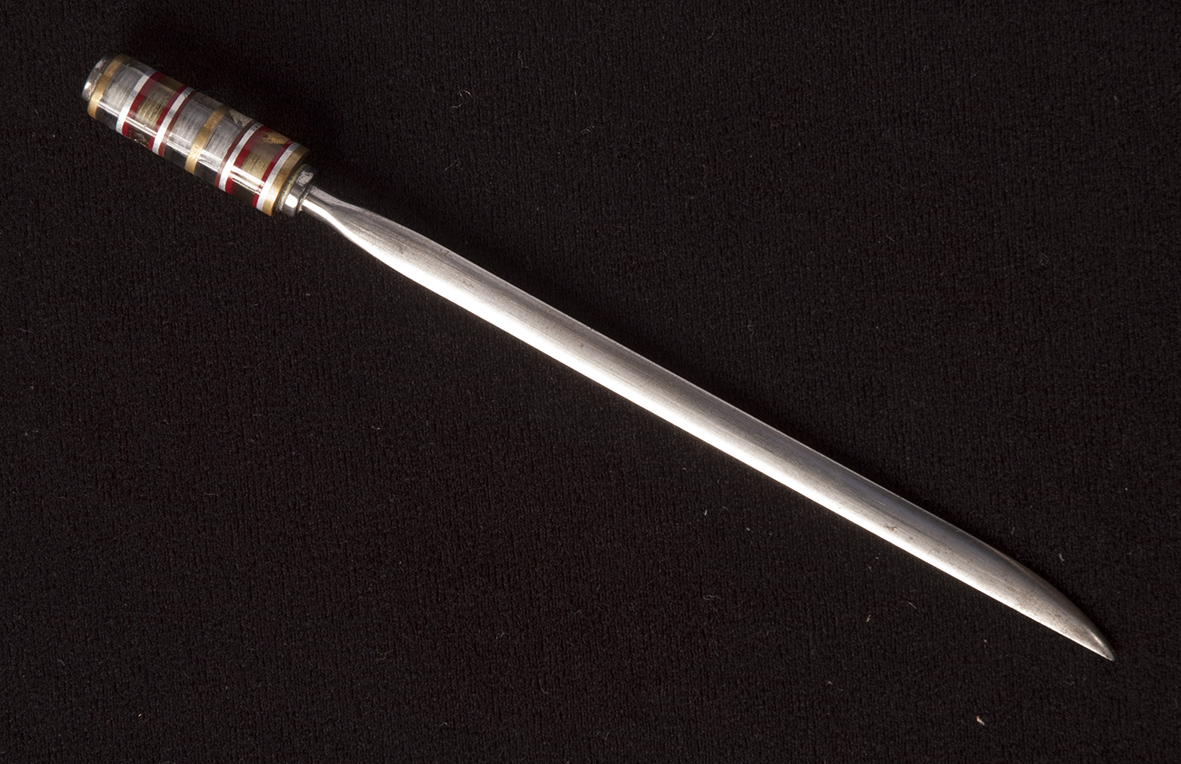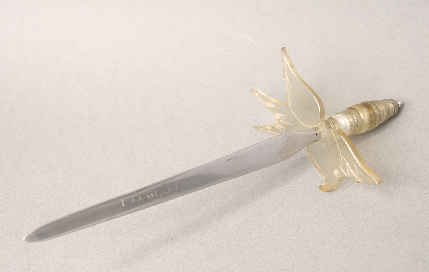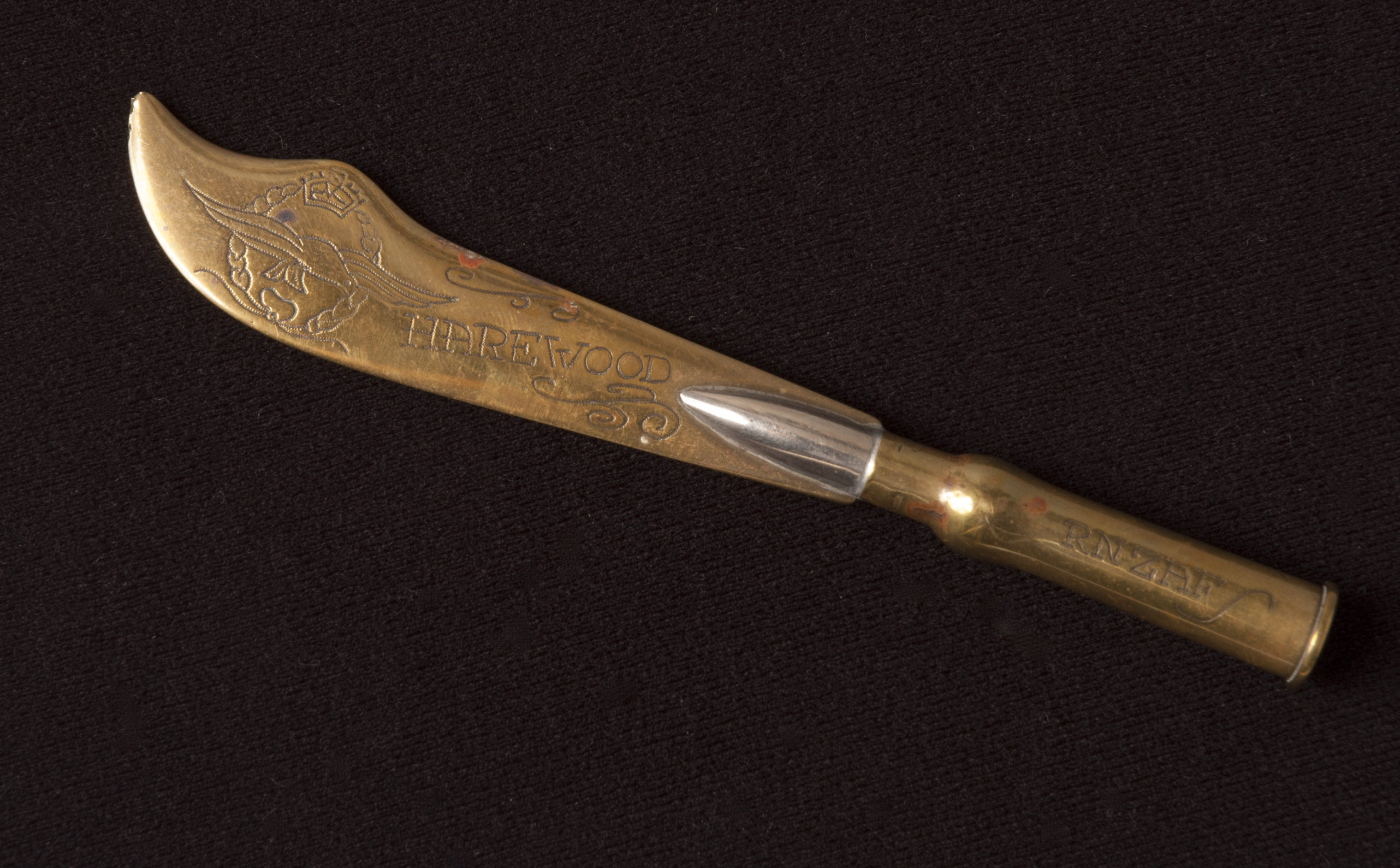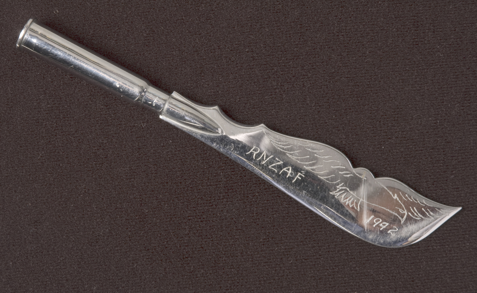 Countless numbers of these implements were produced, in a huge range of styles. A utilitarian object from the time before emails made them redundant, they were fairly easily constructed from a .303 rifle bullet and scrap metal from a shell casing, a hacksaw and a soldering iron. They were often engraved with the maker’s name and unit, or the place where he was serving. Many were chrome-plated when they arrived back in New Zealand at the war’s end.