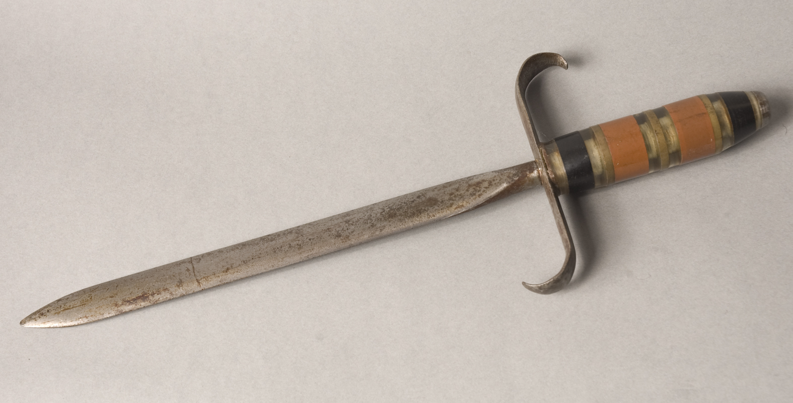 The blade might be cut from beaten brass from an artillery casing, or sometimes from an aircraft strut, as in Figure 7. This example is one of the few whose provenance is known: it was made by Alan Minola, who was my Technical Drawing teacher at Orewa District High School (now Orewa College) in the 1960s. Allan served as an aircraft mechanic with the RNZAF in the Bismarck Archipelago. The sharp, stiletto-like appearance of Alan’s design gave him concern when I visited him shortly before his death. He expressed the thought that it should be destroyed because he considered it dangerous.