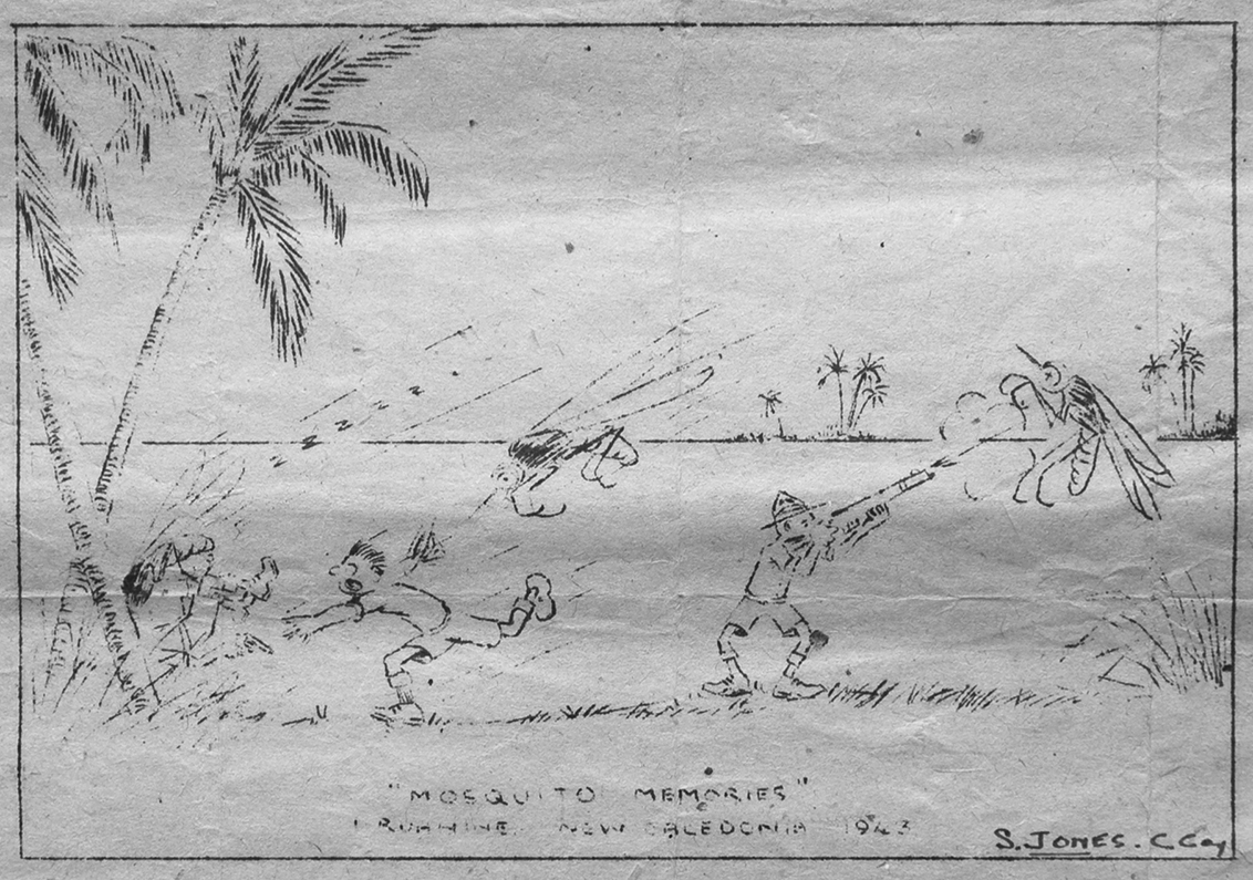 ‘A Yankee officer told us a “gag” about the mosquitoes back in his home state. At a camp there, two “mossies” were heard talking. One said, “Shall we eat this guy here, or carry him across the lake?” But the other “mossie” answered, “If we take him over there, the big ones will get him!”‘ – Harry Stone, New Caledonia, Diary No. 1, Wednesday 10 March 1943