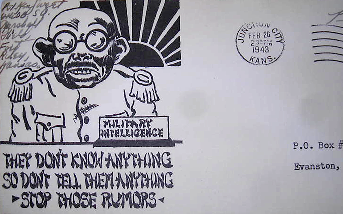 A fifth anonymous American example, although it originated in Kansas rather than the Pacific, features a racially unflattering portrayal of the Japanese general and wartime Prime Minister Hideki Tojo (Figure 50), and a warning against spreading rumours that might assist the Japanese war effort.