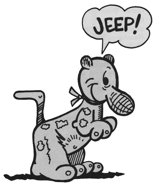 It is interesting to note in passing the origins of the name of this most versatile and resilient of WW2 vehicles. The most common impression is that it is a contraction of the term “General Purpose vehicle” – GP – and this is a good indicator of its primary role. However, according to a Readers Digest compendium of interesting facts published in the 1970s, the name originally came from a “part dog, and wholly fantasy” character created in 1937 by the American cartoonist E. C. (Elzie Crisler) Segar (Figure 19): “Jeeps, according to the strip, were tough little animals who lived on orchids and could become invisible. When…the Willys company of Ohio won a US Army transport contract with a powerful open-topped 4-seater vehicle that was just over 3m long and could go anywhere, soldiers gave the rugged little machine the same name.” – “Strange Stories and Amazing Facts”, Readers Digest Association, second edition, 1975.