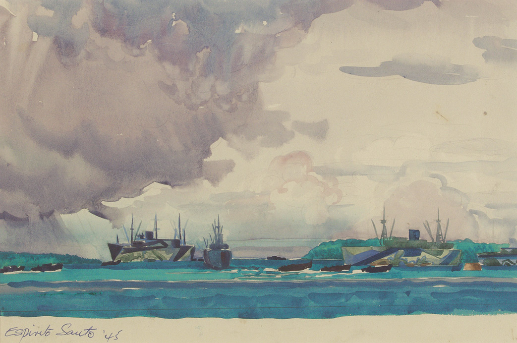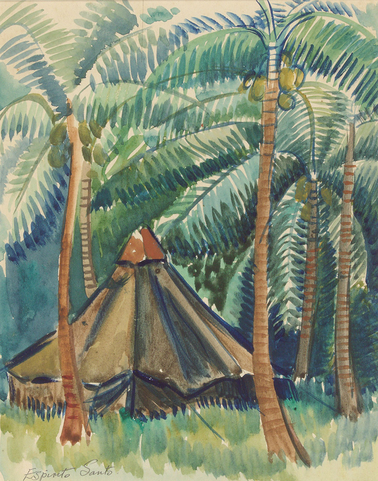 The works below (Figures 21 – 23, 24 and 25) are by the same artist but are completely anonymous. On every one of these works, presently in the Colin Moyle collection at the Auckland Museum, the artist has recorded that it was made on the Island of Espiritu Santo (the artist mistakenly spells the name of the island Espirito Santo, which is actually an area in Brazil), the largest island in what is now known as the island nation of Vanuatu, in the last year of the war, but has signed none of them. This island was not invaded by the Japanese but it was an American naval and air force base for much of the war. None of this artist’s works is signed. Frustratingly, the location and often the date of each has been recorded, but nothing else.
