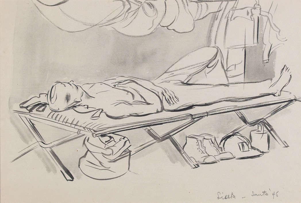 One can only speculate at the circumstances that lead to Foreman making this drawing. It is likely he was laying on his bunk on a hot afternoon, nothing to do, and decided spontaneously to pick up his pencil and record the scene before him, as a memento to take home to show his family.