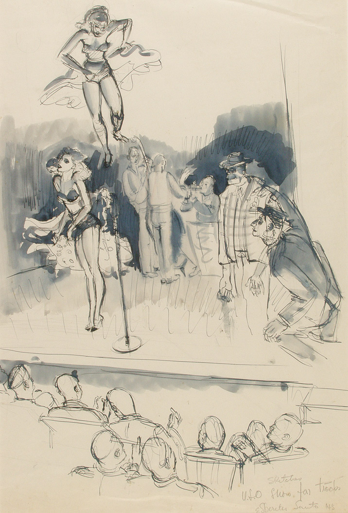 Like many other soldier artworks in World War 2, these images provide us with an intimate record of, and insight into, the life of servicemen during their relaxation and off-duty time. From the evidence of the works included here it is clear that the artist was highly skilled in watercolour, wash and brush and ink media.