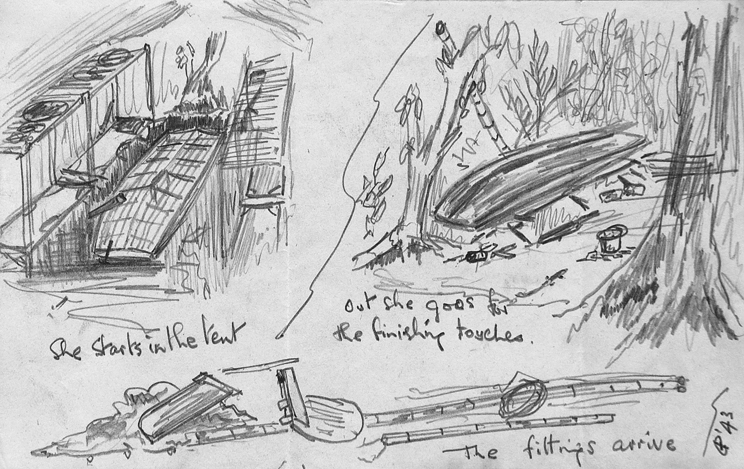 The loose thumbnail sketches of a boat being built – “She starts in the tent…Out she goes for the finishing touches…The fittings arrive” – could have been observational notes for a later work, perhaps in another medium, and are dated 1943 (Figure 11). This is more likely to have been drawn on Mono or Stirling Island.