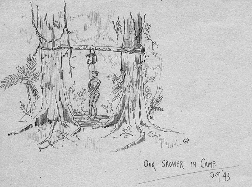 At other times his drawing was looser, more impressionistic. He drew the human figure rarely and does not appear confident doing so. The charming depiction of a man having a shower, awkwardly covering himself as if embarrassed by the artist’s presence (Figure 9), was drawn in October 1943, which suggests that it might have been created in Guadalcanal, since the invasion of the Treasuries did not take place until October 28.