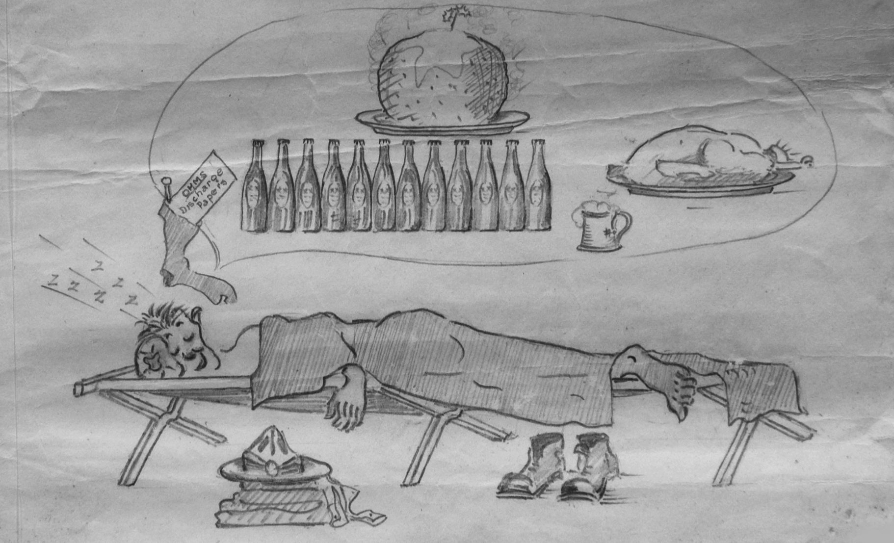 In the third drawing, a sleeping soldier dreams of rows of bottles of beer, roast turkey and Christmas pudding and, most importantly of all, projecting from an imaginary Christmas stocking, his discharge papers (Figure 28). It is likely that this drawing was produced to mark Christmas 1943.