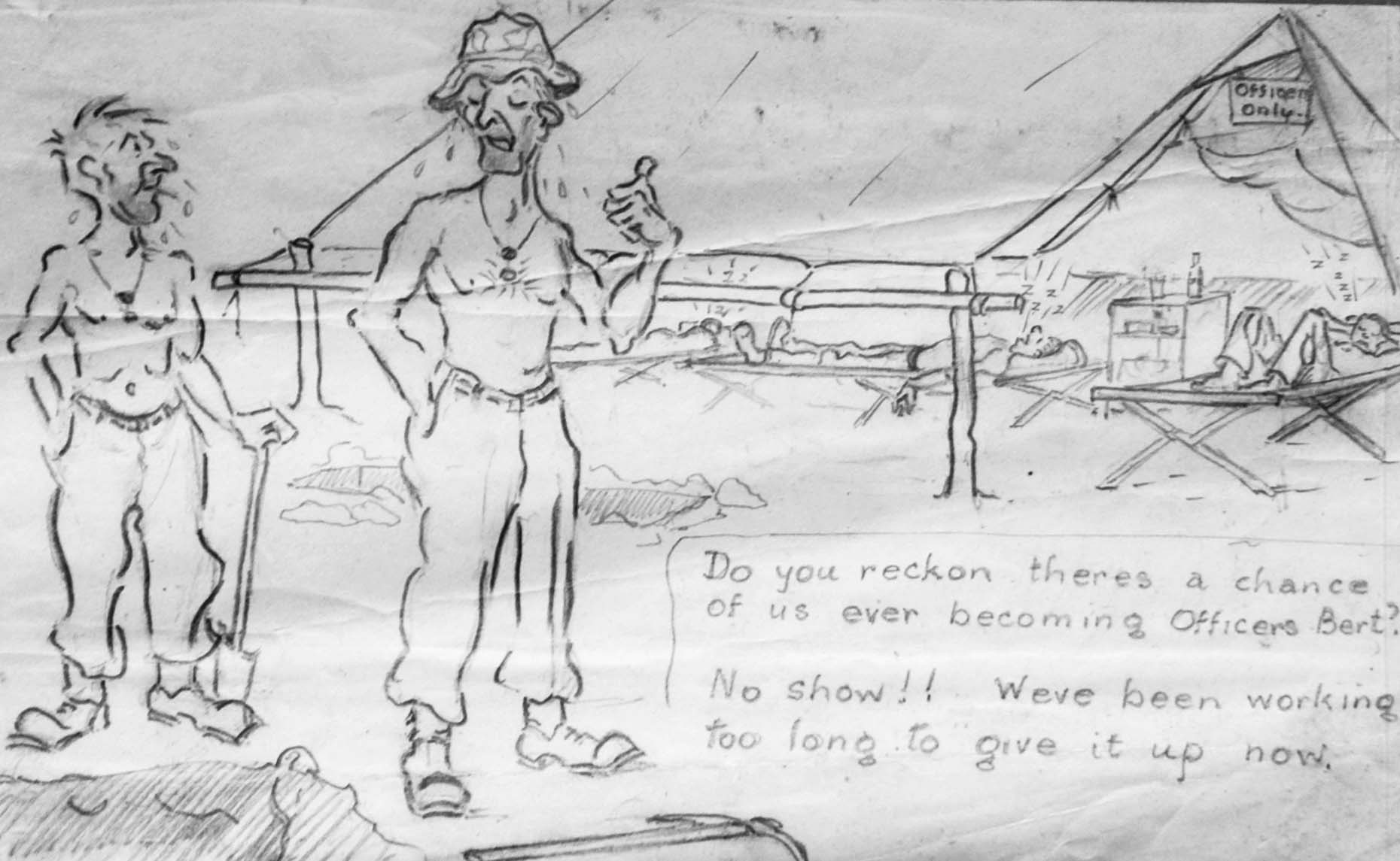 Cartoons: Humour in New Zealand soldier art in the Pacific War, often sardonic, took many forms and was a good antidote to general boredom, homesickness and resistance to, if not outright contempt for, the army, officers and general bureaucracy. Cartoons could be hand-drawn for sharing within a soldier’s particular unit or made for reproduction in service newspapers or magazines.