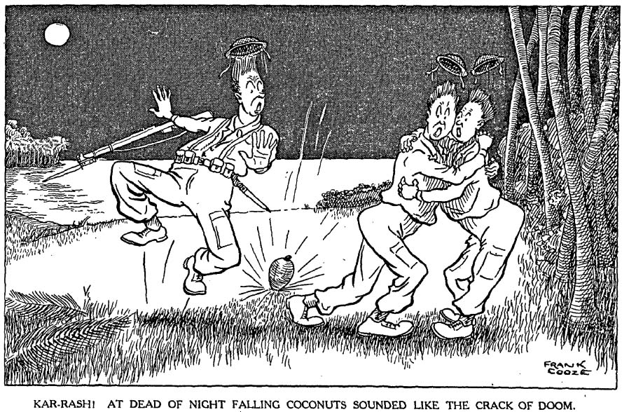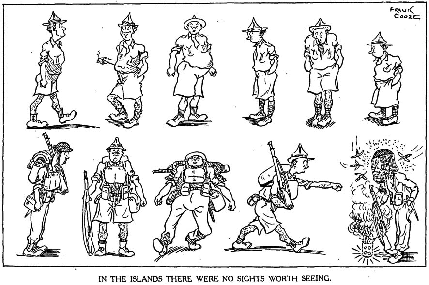In one of the few drawings with a signature (S. Jones C Company) the hoary subject of large, ferocious tropical mosquitoes is taken on, with a soldier firing his rifle at one of the giant insects as his mate beats a retreat on the left of frame (Figure 29).