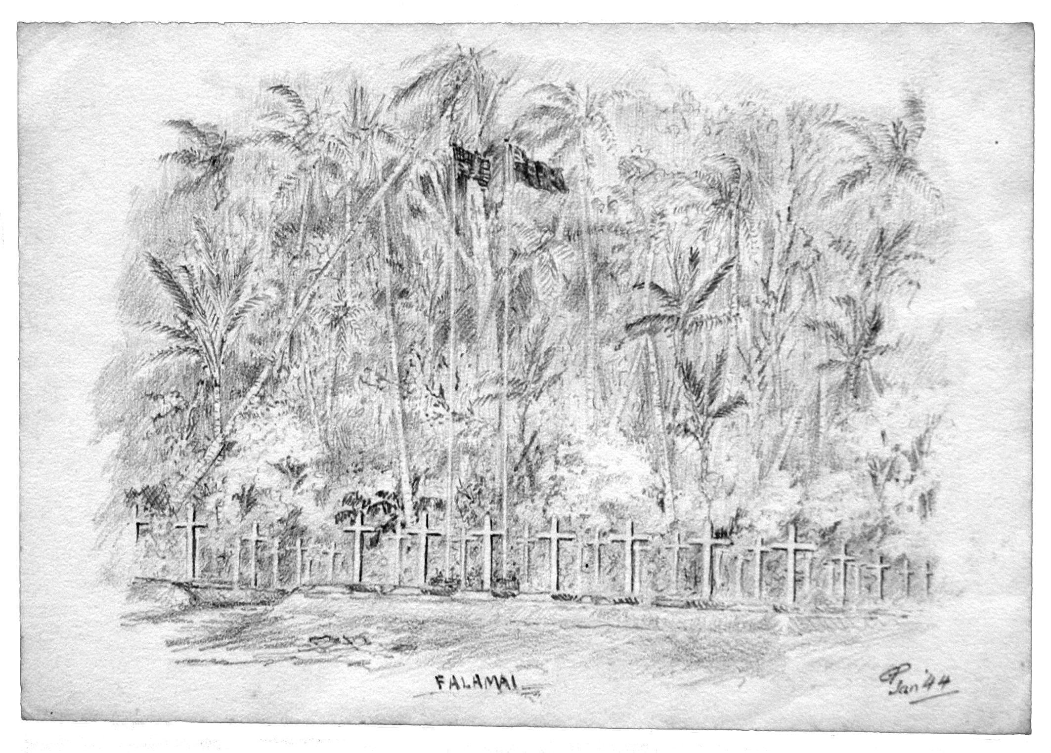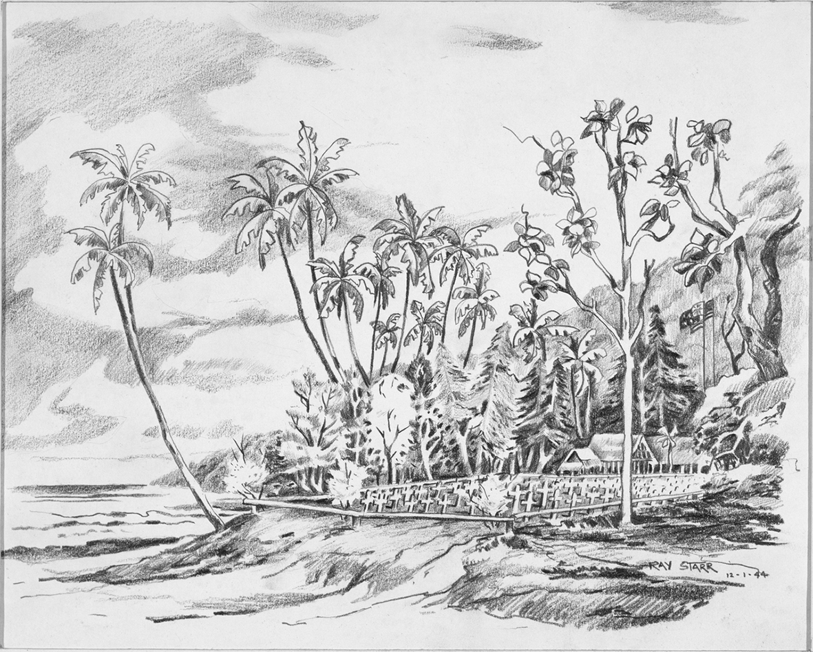 It is interesting to compare Park’s drawing of the Allied Services Cemetery at Falamai (Figure 12) with Raymond Starr’s recording of the same place (Figure 13). Park’s version is flatter, more two dimensional. The row of crosses blend in the the precisely rendered jungle foliage in the background. Almost lost amongst the vegetation are the two flagpoles with the Stars and Stripes and New Zealand flag fluttering above. The pattern-like treatment of the scene creates a more abstracted image than Starr’s composition. Interestingly, both drawings were made in January 1944, which begs the question of whether the two men knew each other: perhaps they had gone out together to draw the cemetery.