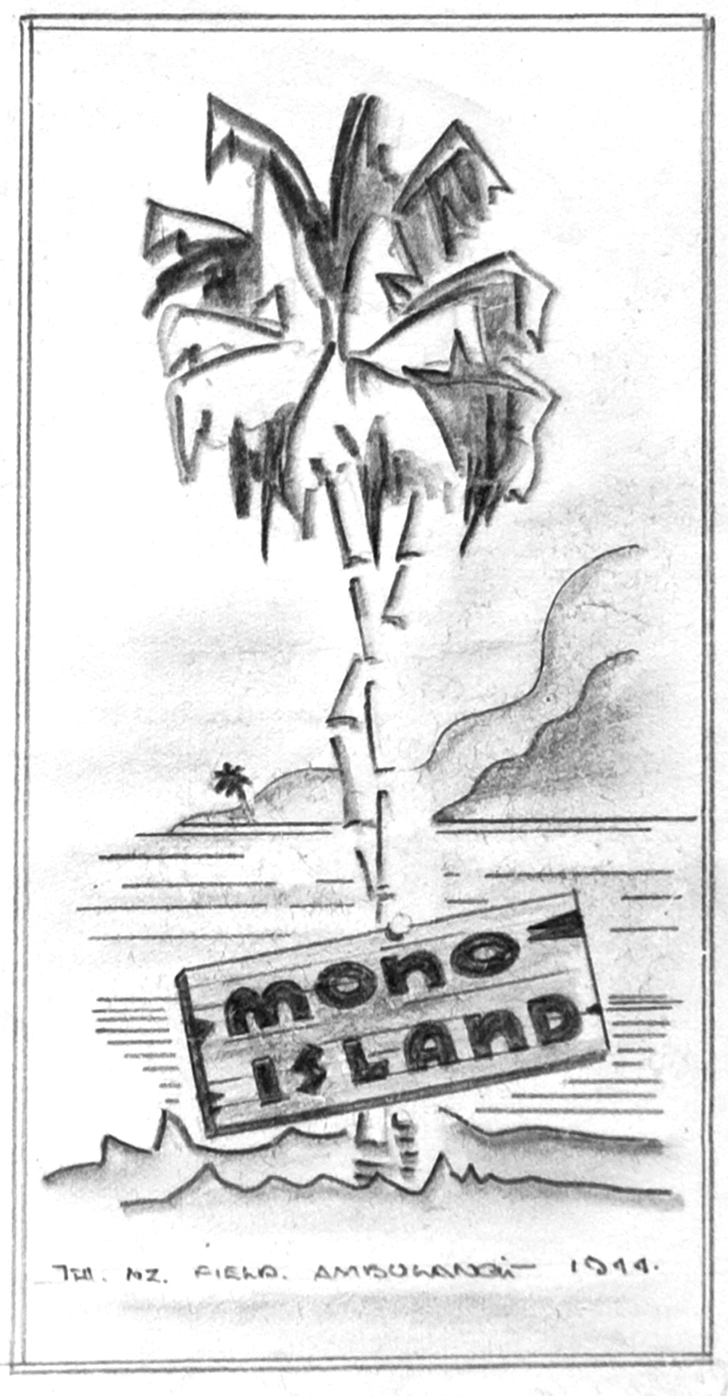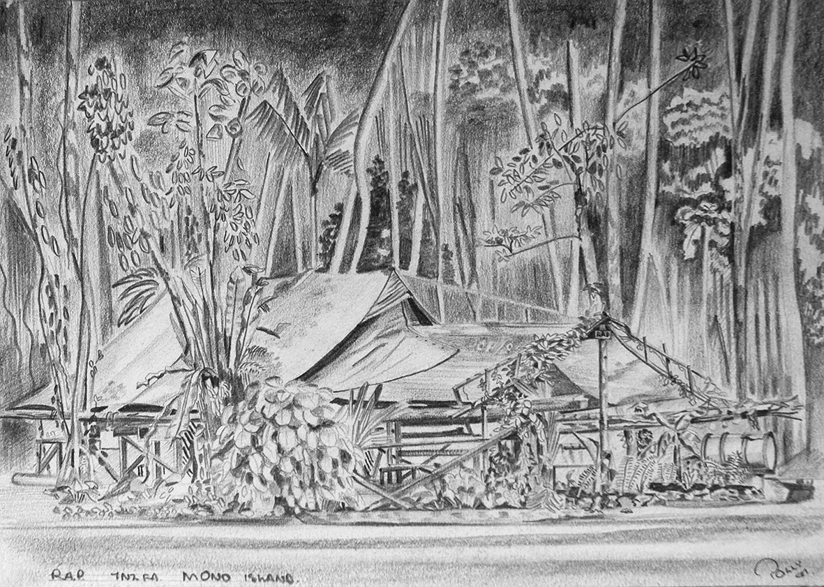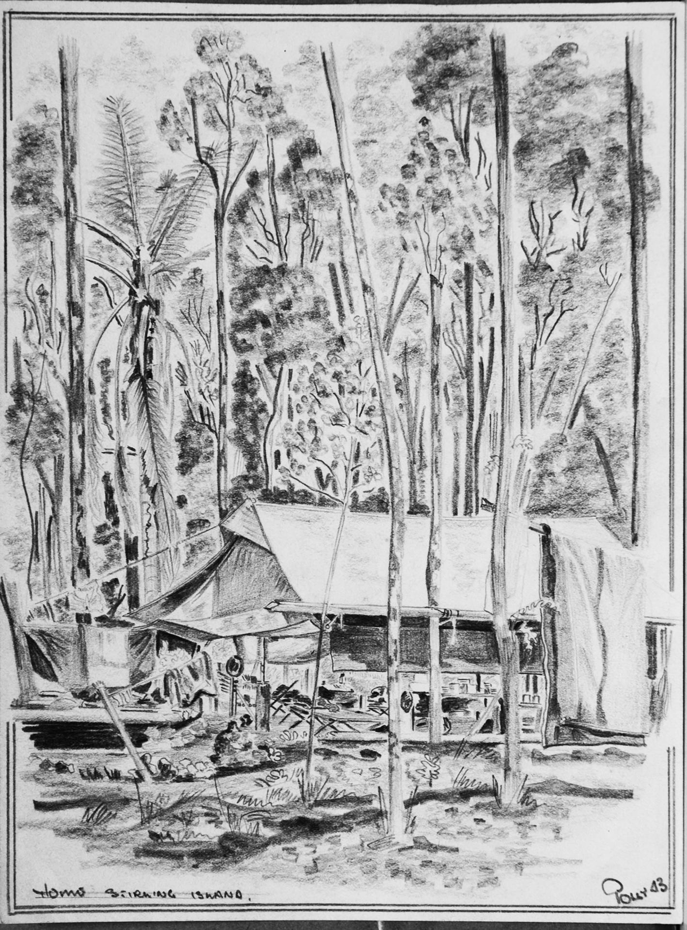 On the evidence contained in one of his many skilfully toned pencil drawings (Figure 3), it appears Arthur Owen “Polly” Pollock, a Sergeant attached to the 7th Field Ambulance, was based on Mono Island. He is recorded on the Auckland Museum’s Cenotaph site as being from Napier, where he was apparently a window dresser before the war. He produced many drawings during his time in the Pacific, but while one of his drawings depicts the Field Ambulance base being on Mono (Figure 4), another shows his “Home” being on Stirling Island (Figure 5). The drawing in Figure 4 shows the RAP (Regimental Aid Post), on Mono Island, which is presumably where Pollock was based. (The Regimental Aid Post is a front-line military medical establishment incorporated into an infantry battalion or armoured regiment for the immediate treatment and triage of battlefield casualties, but also the treatment of general medical issues such as accidental injuries, insect and snake bites. In the US forces, the equivalent is the Battalion Aid Station.)