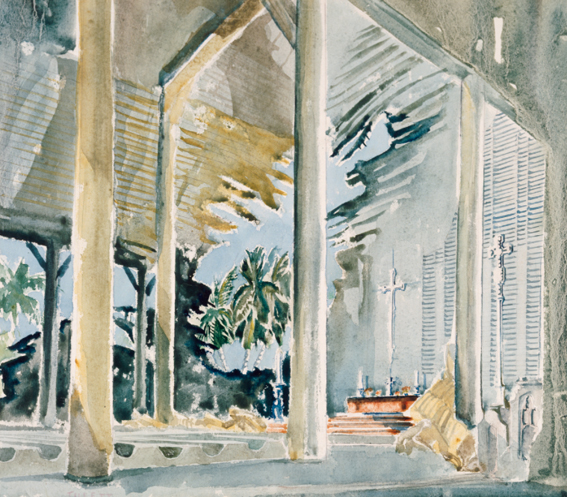 The monochromatic wash in Figure 14 is by a soldier identified by Auckland Museum Cenotaph as Linwood Anthony Lipanovic, who lived in Mount Albert, Auckland. He was a Sergeant and belonged to a camouflage unit, and also worked for the Current Affairs branch of the Army Education and Welfare Services (A.E.W.S.). He was a painter and decorator in private life. The painting appears to show the reconstruction, by New Zealand soldiers, of the church that was shelled during the invasion of Mono Island. It was being used as an ammunition dump by the Japanese (Figure 14). Oscar Kendall also made a watercolour painting of the church under construction (refer to website section on Oscar Kendall).