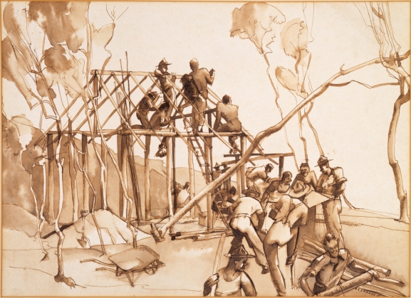 Many of the men tried their hand at boat building when the Japanese had been driven off and things had settled down in November and December. Oscar Kendall depicted a group of men working on a dugout canoe on December 2 1943.
