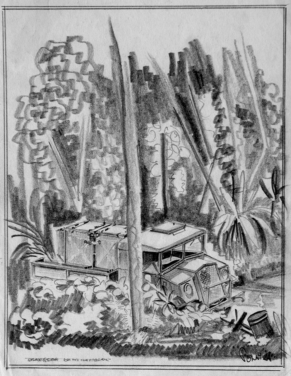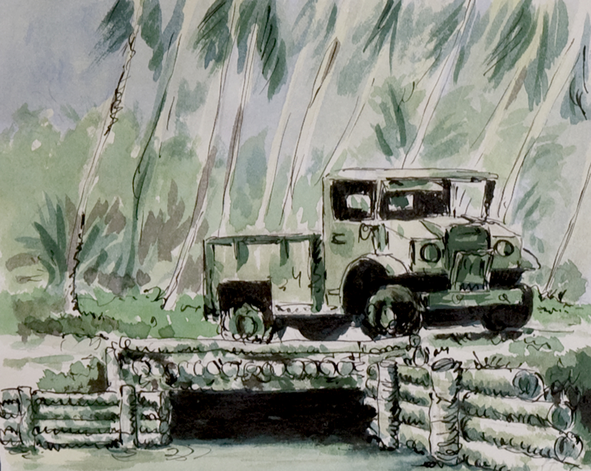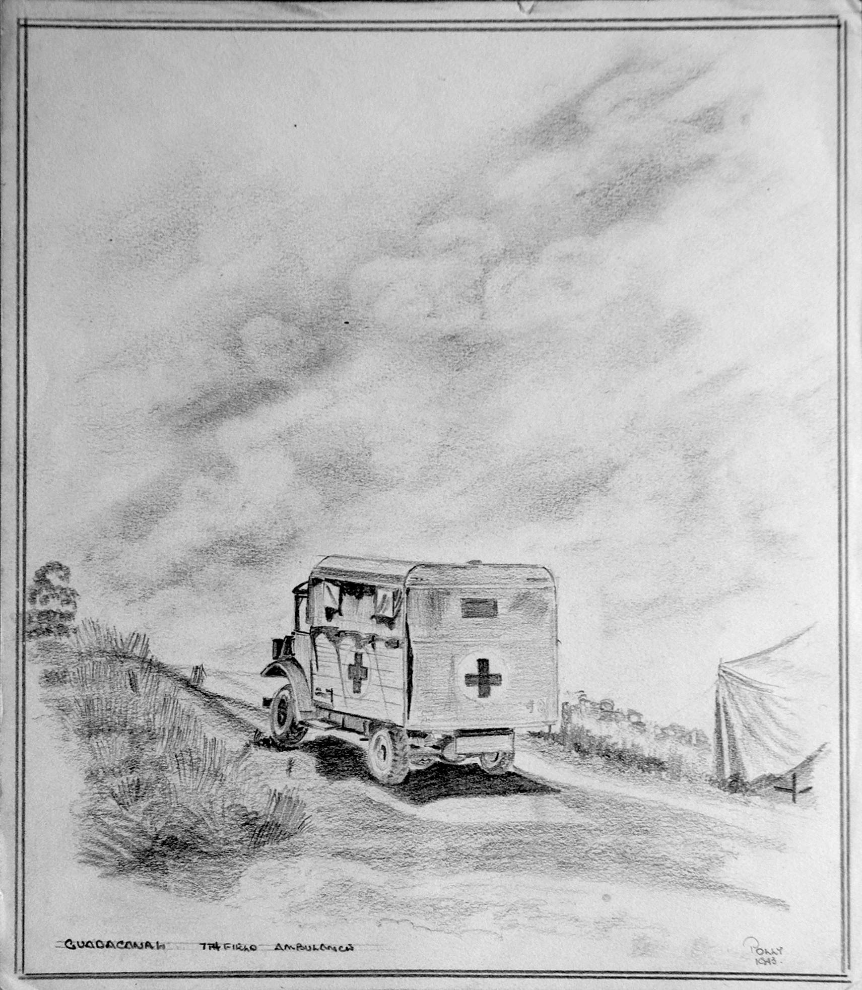 Many of Pollock’s drawings, like so many made by other artists, document the daily activities and setup of his medical unit, whether it be a mosquito spray unit such as the Ford 4×4 truck with spray tanks on the tray in Figure 6, or an ambulance going about its business in Figure 7.