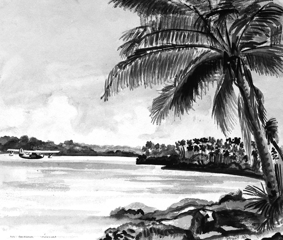 However, another strand in his drawings takes a more fantastical direction, where he appears to synthesise a composition from several different sources. The indian ink wash drawing of the PBY Catalina moored in a logoon is an example (Figure 8). Like the Pollock image included in this website’s section on “Migration of Imagery”, the aircraft does not quite seem to be part of the scene: it is difficult for the viewer to discern whether it is flying close to the water or is anchored at rest in it.