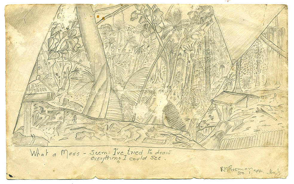 For the young soldiers, who had in most cases never travelled overseas before, the exotic tropical vegetation and landscapes they found themselves in, as well as the native islanders they encountered, so different from what they experienced at home, also provided the motivation to visually record their surroundings in some form. With cameras banned by the authorities, what better way to document their new experiences than with pencil and paper?