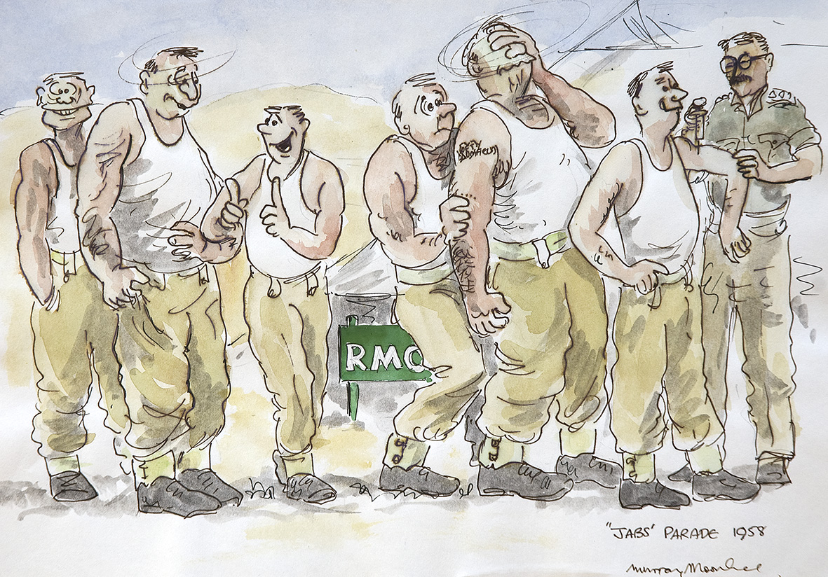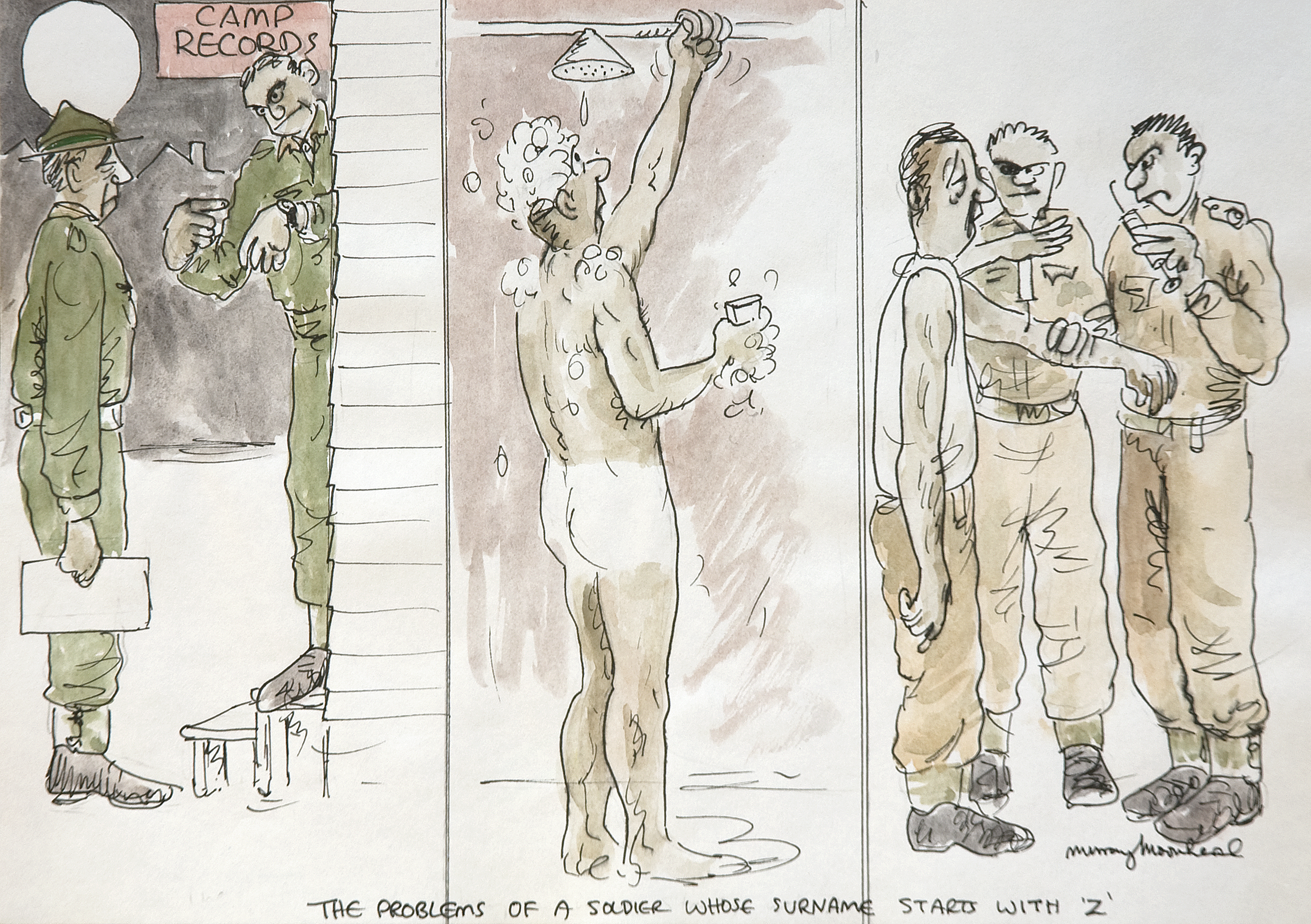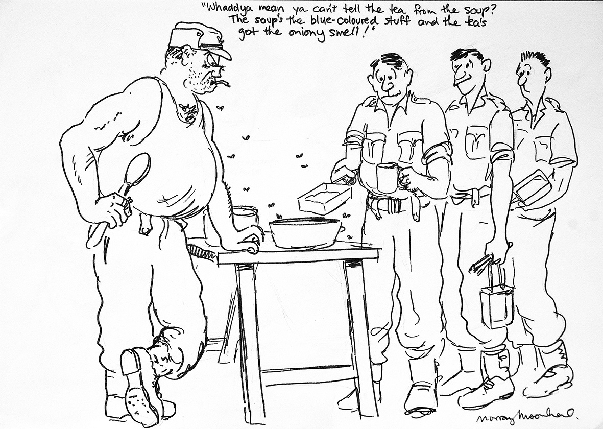 Another interesting army cartoonist was Murray Moorhead. Moorhead was born in New Plymouth 1934: too late to participate in WW2, he was called up for Compulsory Military Training in 1952 and, like Harry Stone, was trained on 6-pounder anti-tank guns. He remained in the Territorial Army until 1967 when he retired with the rank of Staff Sergeant.