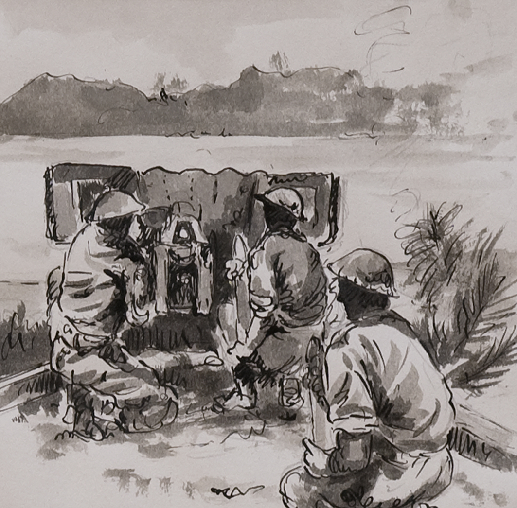 Amongst the collection of pen and ink and watercolour works by Moorhead, housed at the Army Museum in Waiouru, there are ink-wash and water-colour paintings which appear to have had their origins in photographs from the war in the Pacific, including soldiers on patrol, a Ford 4×4 truck (a vehicle surely designed for maximum ugliness as much as for practical utility), and an anti-tank shoot reminiscent of the photograph of Harry Stone’s unit during a practice shoot on Stirling Island at the beginning of 1944 (Figures 33 – 35).