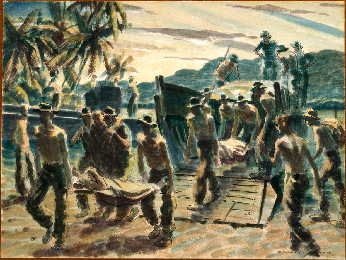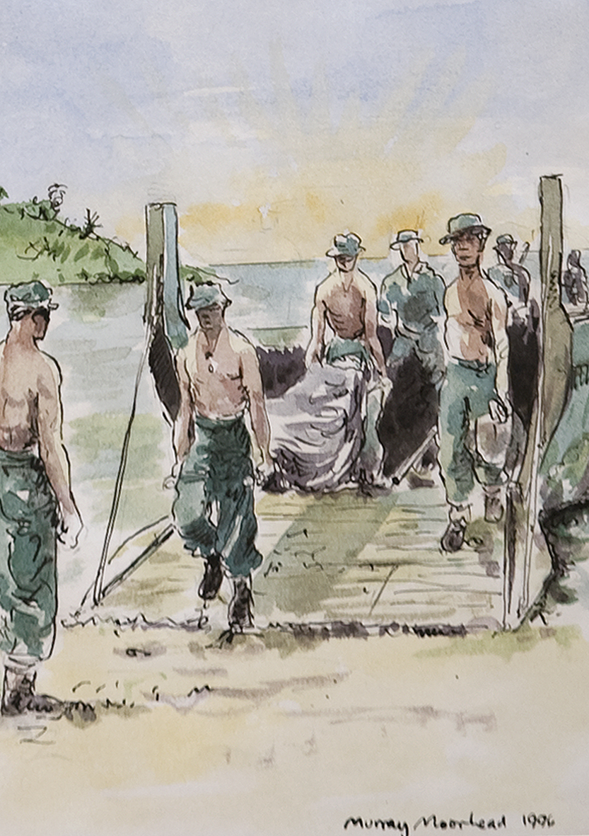 There is also a small watercolour of wounded soldiers being unloaded from a landing craft which is very similar to Russell Clark’s work of wounded being unloaded on Stirling Island, itself based on a photograph (Figure 36 and 37).