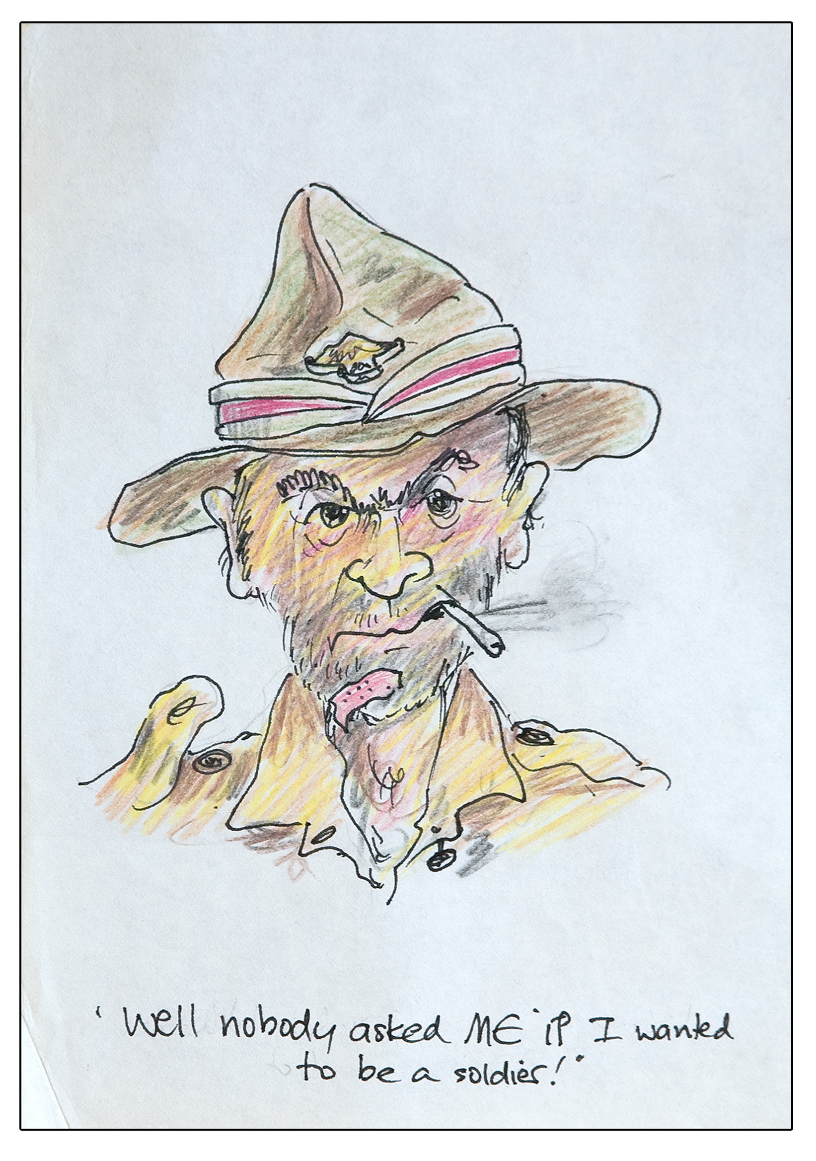 What makes his army cartoons particularly interesting, apart from the acerbic humour many of which project a quite negative impression of institutionalised army life and culture, is the fact that, despite not serving at the time of WW2, so many are of his images are based on the Pacific War.