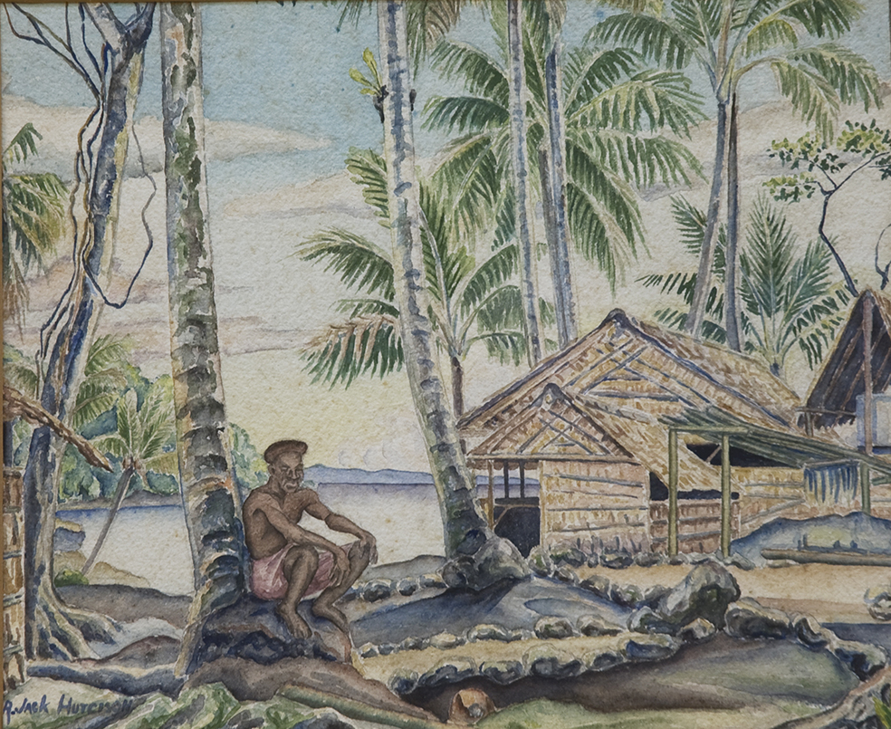 The painting of a native man seated on the base of a coconut tree in Figure 16, signed R. Jack Hutchison, is by Richard Jack Hutchison, who was from Christchurch at the time of his enlisting. It depicts an iconic Pacific Island scene that belies the impact of war in the Solomons at the time. The brightly coloured, naively painted image gives us an informative record of the lifestyle of the native Solomon Islanders. The native man, rather awkwardly painted, sits on the left of the frame, a substantial thatched building behind him on the right. Coconut trees frame a lagoon in the background.The war does not intrude on this delightfully rendered scene, which could have been made yesterday rather than during the War in the Pacific.
