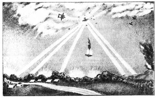 “One plane was caught in the searchlights for a moment then burst into flame, falling straight to earth. The lights caught a second one and a ‘night fighter’ finished it off. Boy did she burn, half way down the plane broke up, evidently one wing and motor fell rapidly past the burning fuselage. The motor left on the plane screamed as she came down, hitting the ground with a hell of a wallop and a good flash.”