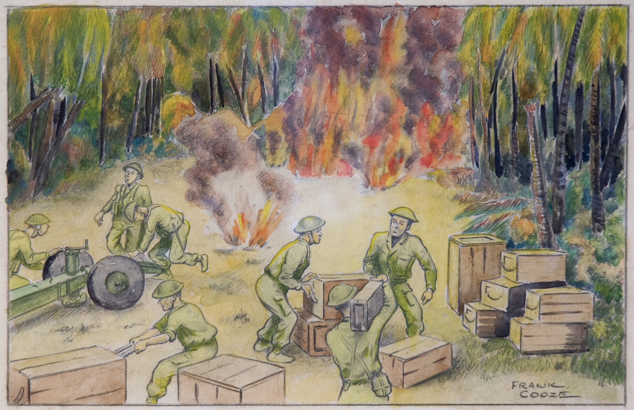 Cooze was also present during the invasion of Mono Island, apparently going in with the First Echelon. My father was part of the Second Echelon. The New Zealand National Army Museum holds a delightful naively painted watercolour called “Landing Stores on Mono Island” (Figure 2), showing Japanese mortars exploding amongst the New Zealand soldiers as they work to establish a beachhead. A tent is on fire in the background. The figures appear strangely static: it is interesting to compare this with official war artist Russell Clark’s more dramatic and animated versions of soldiers under attack (refer to section on Russell Clark).