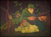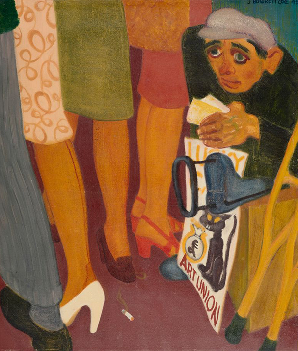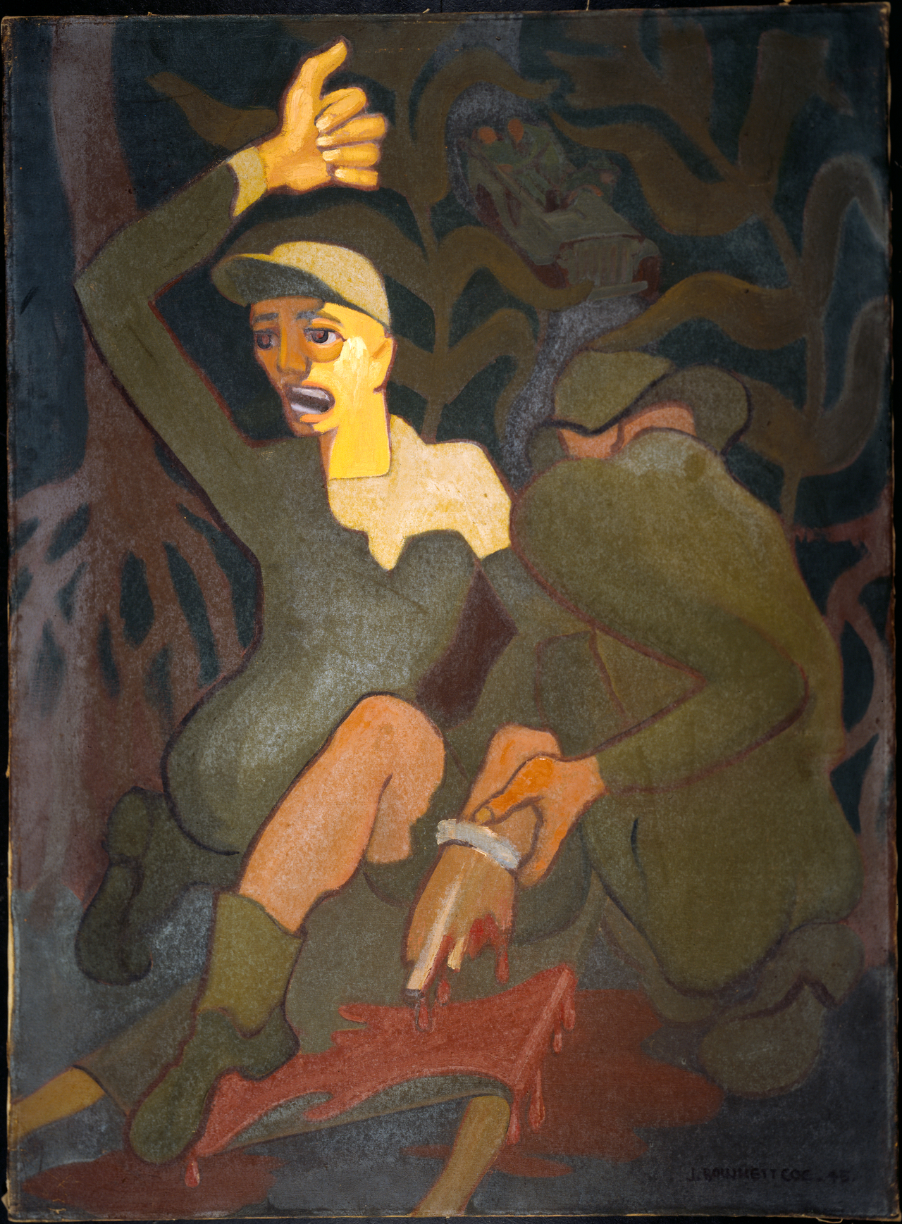 Also in the Te Papa collection is a painting of a Wellington lottery ticket seller (Figure 6), made in 1945, the year the war ended . This painting is made in the same expressive style as the two earlier works shown on the National Archives War Art website, and depicts a man wearing a leg extension device, sitting at a very low level on the pavement surrounded by the legs of passersby. A pair of wooden crutches is propped up next to him. Perhaps this is the victim in Figure 5, struggling to survive with his disability, the forest of mangrove trees now replaced by a forest of anonymous legs?