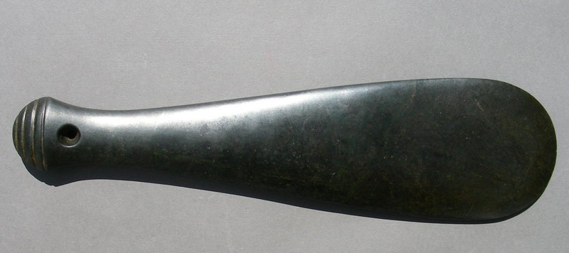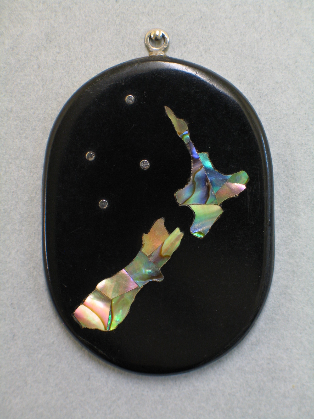 The pendant based on a map of New Zealand (Figure 11) features a mosaic of different shell sections carefully inlaid together. The Southern Cross, visible from New Zealand and incorporated into the New Zealand flag, is represented by four metal points, while the base material, likely bakelite or perspex, is reminiscent of New Zealand greenstone or pounamu, used by Maori to make mere (war clubs) (Figure 12) and hei-tiki pendants (Figure 13).