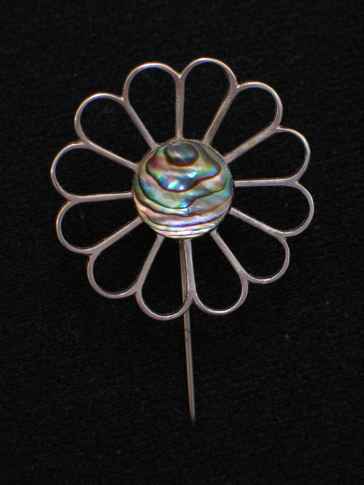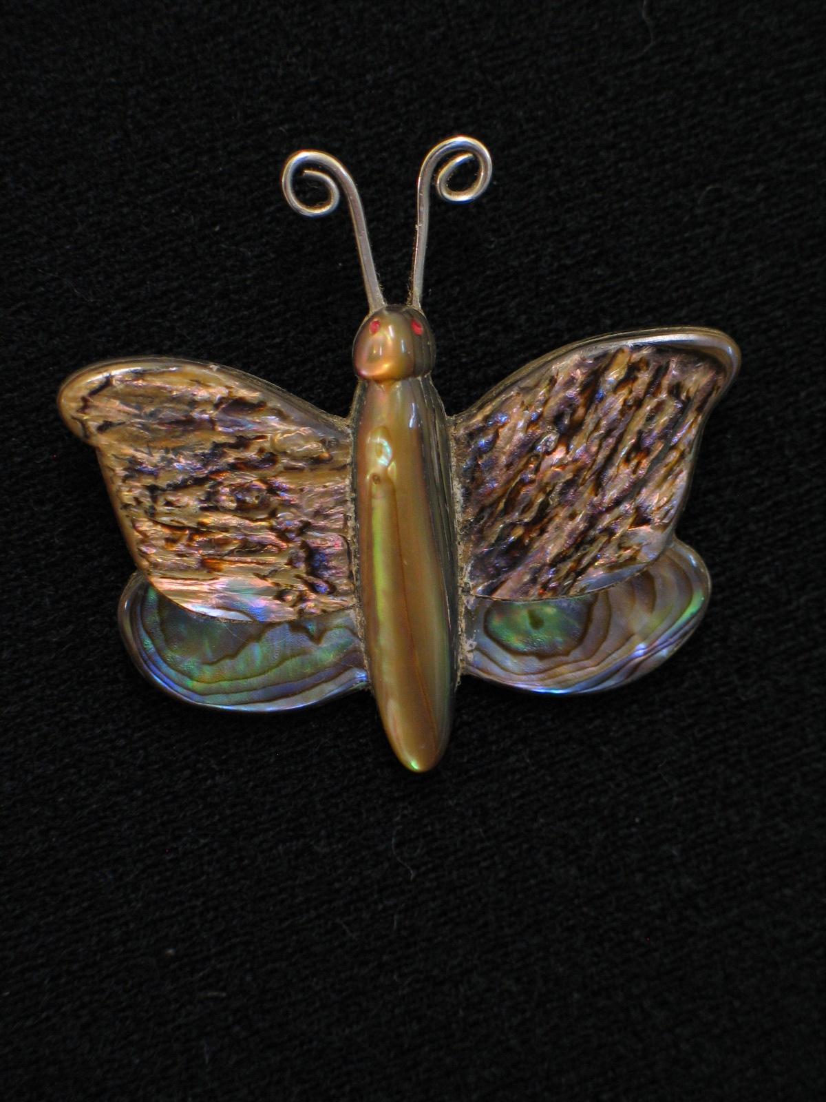 Hermanns integrated this culturally significant material into many of his jewellery pieces. The flower shaped pin in Figure 9 uses a single cut piece of paua shell, the brooch in Figure 10 utilises the interior and exterior paua shell patterns for the two layers of the butterfly wings, while it appears that the body of the butterfly was made from a spent rifle bullet.