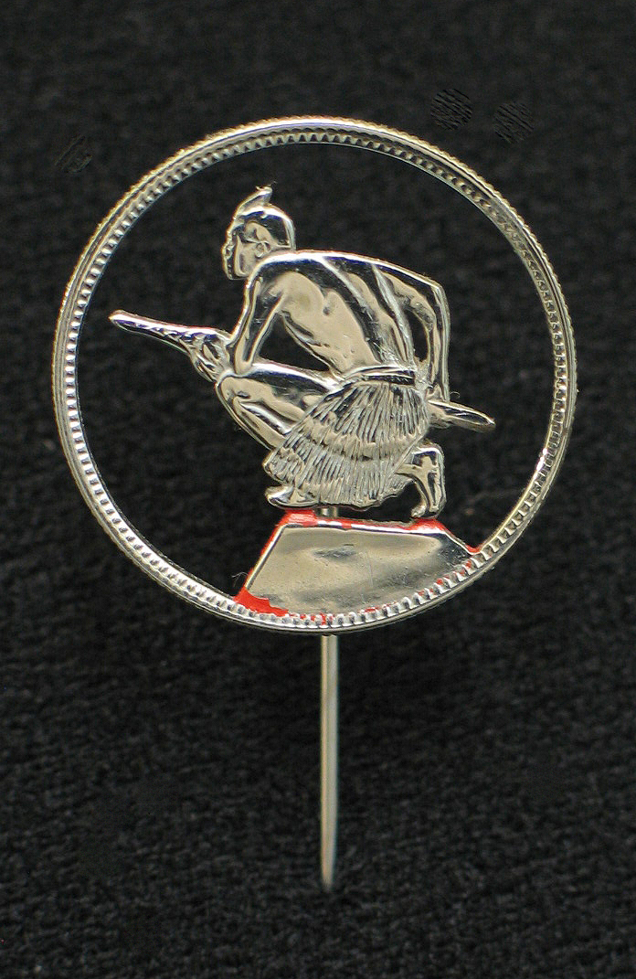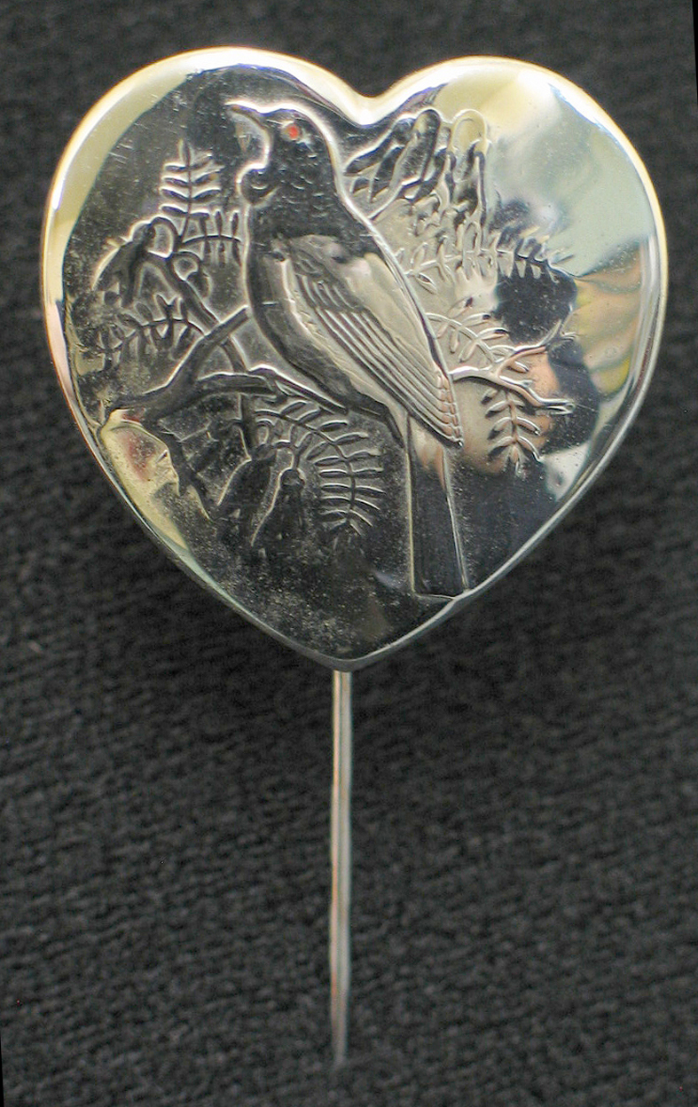 It is his handcrafted jewellery that impresses the most. The delicacy and fineness demonstrated in his jewellery pieces is remarkable, especially when considering the wartime conditions they were created in. The equipment he had available to him as an aircraft engineer was a major factor in the creation of these objects, but one can only wonder at the sharp vision, patience and steady hand required to cut and file details from New Zealand coins to use as the basis for many of his pieces (ironically, Hermanns’ eyesight today is severely impaired along with his hearing). The pins shown in Figures 3 – 5 are made from 1940s New Zealand coins: a sixpence, shilling and florin.